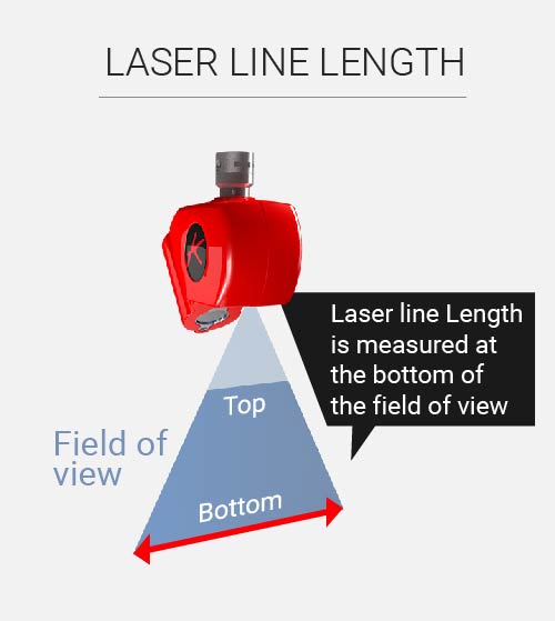 Mối liên hệ giữa chiều dài đường laser và góc nhìn/trường nhìn (Field of view) Chiều dài đường laser thay đổi tùy thuộc vào khoảng cách từ máy quét đến chi tiết. Máy quét càng ở gần, đường laser càng hẹp (tương ứng với phần đỉnh của trường nhìn máy quét); máy quét càng ở xa, đường laser càng rộng (tương ứng với phần đáy của trường nhìn máy quét). Điều này xuất phát từ cách thức tia laser được tạo ra, nó được phát ra từ một điểm cố định trên máy quét và vẽ thành một hình tam giác trong không gian. Thông thường, giá trị được nhà sản xuất ghi chú trong thông số kỹ thuật là giá trị lớn nhất, tức là giá trị nằm ở đáy trường nhìn của máy quét.