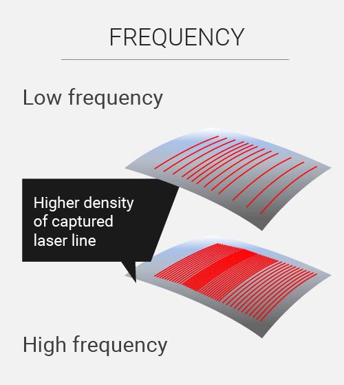 “Một trong những chỉ số quan trọng nhất cần xem xét” Tần số là yếu tố rất hiếm khi được người dùng xem xét trong quá trình chọn mua máy, nhưng thực chất nó lại là một trong những chỉ số quan trọng nhất cần chú ý khi bàn về tốc độ của máy quét 3D. Như đã đề cập trước đó, tần số là số lượng đường laser được thiết bị ghi lại trong mỗi giây. Việc đưa lên bàn cân hai máy quét có cùng tốc độ thu thập dữ liệu nhưng khác nhau về tần số sẽ giúp chúng ta hiểu rõ vai trò của tần số đối với tốc độ quét.