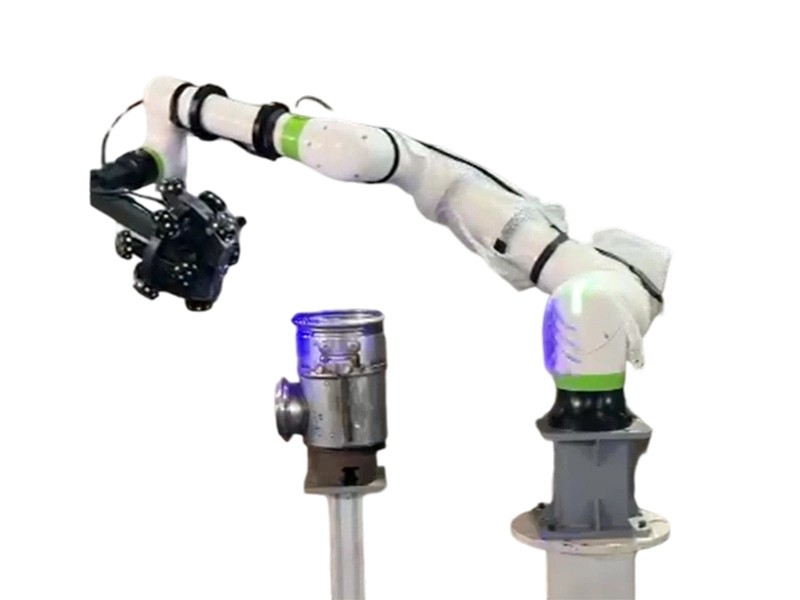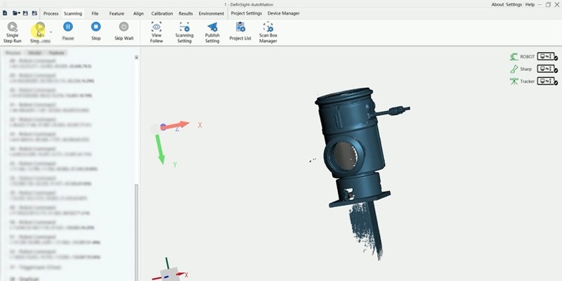 Lập trình quỹ đạo Cobot: Robot cộng tác được lập trình (teaching) để di chuyển đầu quét TrackScan-Sharp bao quanh chi tiết. Quỹ đạo chạy dao quang học (motion path) được tối ưu hóa để quét kín các góc khuất, duy trì khoảng cách tiêu cự và góc quét góc lấy mẫu lý tưởng nhất.