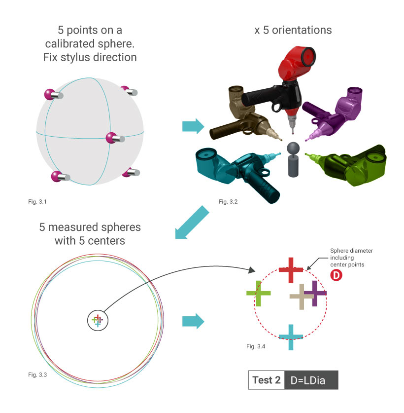 Bài kiểm tra 2: Sai số vị trí do khớp nối, đo chạm – LDia (LDia .5×5 :Art :Tact.AArm) Bài kiểm tra này xác định các sai số sinh ra bởi các khớp nối của tay đo, chủ yếu là các trục số 5, 6 và 7 của khớp. 5 điểm được lấy bằng đầu dò trên quả cầu với đầu dò luôn hướng về cùng một hướng, và quá trình này được lặp lại ở 5 hướng khác nhau. Tâm điều chỉnh tối ưu của quả cầu sẽ được tính toán cho mỗi bộ 5 điểm. Đường kính của quả cầu nhỏ nhất có thể bao trọn 5 tâm đã tính toán này chính là kết quả của bài kiểm tra. Quá trình này phải được lặp lại cho hai vị trí của quả cầu trong phạm vi làm việc của tay đo.