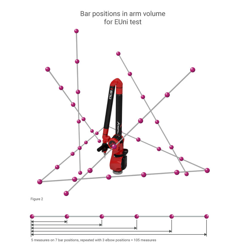 Bài kiểm tra 3: Sai số đo chiều dài đơn hướng, đo chạm – EUni (EUni :0 :Tact.AArm) Bài kiểm tra EUni thiết lập sai số đo chiều dài đơn hướng giữa hai điểm được lấy bằng đầu chạm. Nó dựa trên 105 phép đo chiều dài, mỗi phép đo thu được bằng cách dùng đầu dò chạm vào hai quả cầu. Bài kiểm tra này được thực hiện trên toàn bộ thể tích đo của tay đo, trong đó có tính đến cả các chuyển động của phần khuỷu tay đo. Kết quả kiểm tra không phải là một giá trị trung bình mà tương ứng với sai số lớn nhất trong số 105 phép đo đó. Kết quả càng gần 0, độ chính xác của tay đo trong thể tích làm việc của nó càng cao.