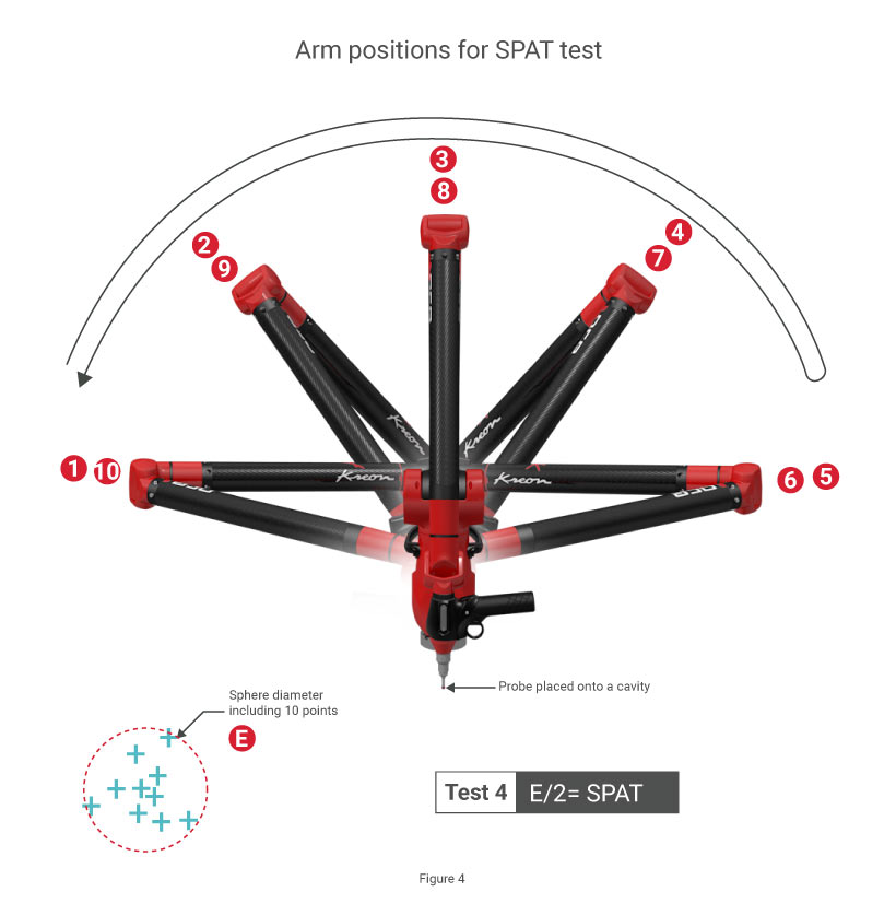 Bài kiểm tra 4: SPAT Bài kiểm tra bổ sung này, được tìm thấy trong phần phụ lục của tiêu chuẩn, có thể được sử dụng để kiểm tra nhanh hiệu suất của một tay đo. Nó xác định độ chính xác đo lường trong khi giữ đầu dò nằm yên tĩnh tiến và khuỷu tay di chuyển từ trái sang phải. Đầu dò được đặt trong một lỗ lõm (cavity), và 10 điểm sẽ được đo tại cùng một vị trí trong khi khuỷu tay di chuyển qua lại. Đối với tay đo 7 trục, khớp nối phải được xoay quanh 180° trước khi đưa nó trở lại vị trí ban đầu. Kết quả nhận được là bán kính của quả cầu nhỏ nhất bao quanh 10 điểm đã đo.