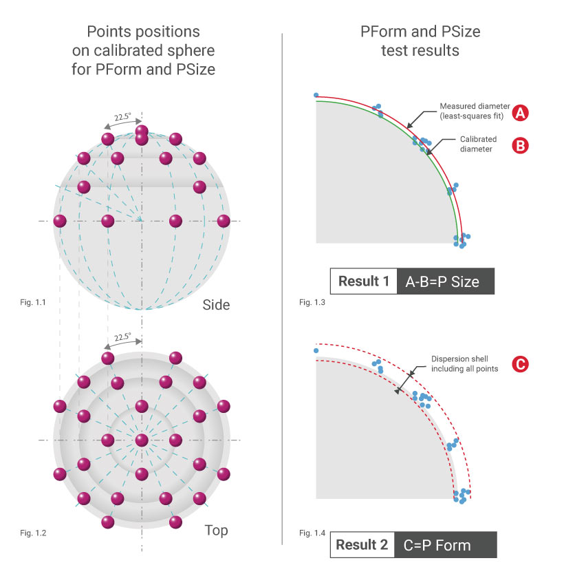 Sai số hình dáng trên quả cầu chuẩn, đo chạm – PForm (PForm.Sph.1×25::Tact.AArm): Bài kiểm tra này, được phát triển dựa trên bài kiểm tra trước đó, thiết lập sự phân bố của các phép đo tiếp xúc (đo chạm) trên một quả cầu. 25 điểm được lấy bằng đầu dò trên một quả cầu chuẩn, và một quả cầu bình phương tối thiểu sẽ được thiết lập từ 25 điểm này. Kết quả của bài kiểm tra là độ dày của một "lớp vỏ" bao quanh 25 điểm đó, với tâm của lớp vỏ chính là quả cầu bình phương tối thiểu. Quá trình này phải được lặp lại ở hai vị trí khác nhau của quả cầu nằm trong thể tích làm việc của tay đo. Kết quả nào kém hơn trong hai kết quả đó sẽ được sử dụng làm thông số.